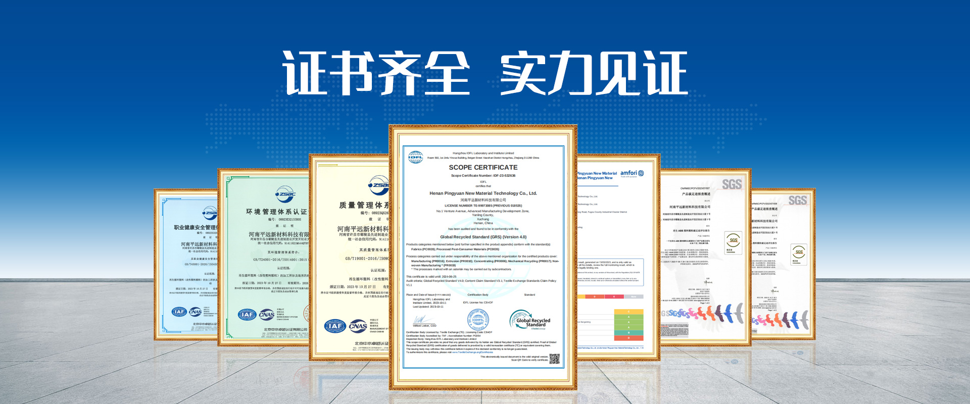 河南平遠新材料科技有限公司已通過ISO9001質量體系、14001環境體系、45001職業健康安全管理體系認證;GRS全球回收標準認證;美國UL OBP 2809趨海塑料認證;BSCI商業社會標準認證;LCA生命周期認證。